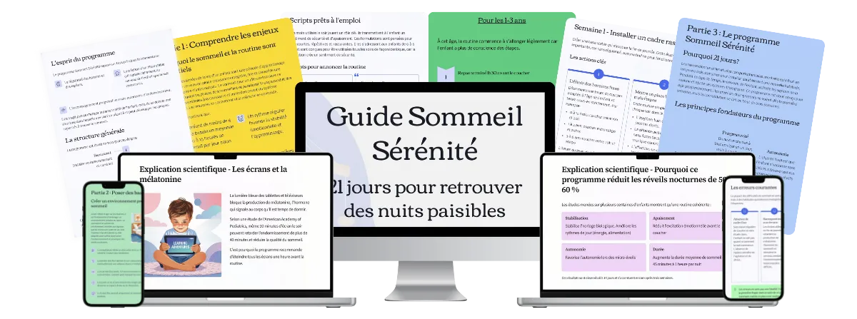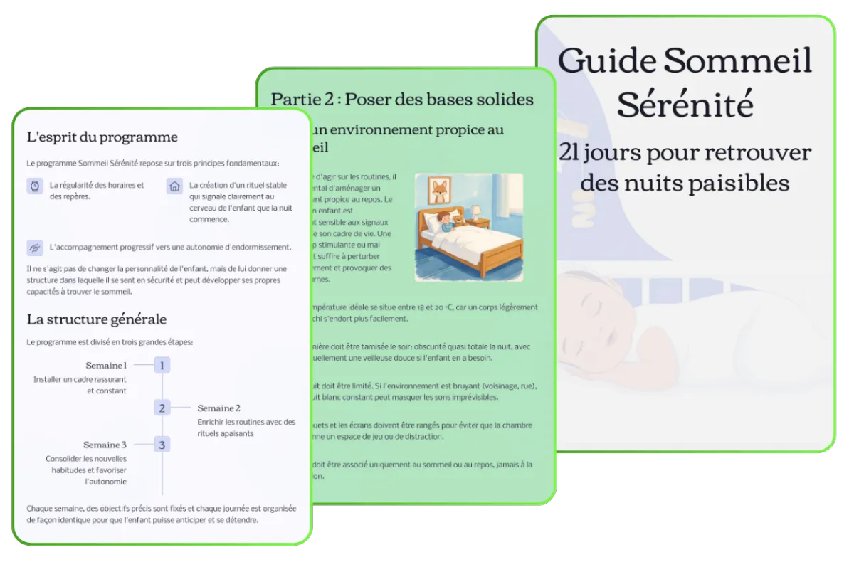 Rejoignez le programme complet Sommeil Sérénité 21 Jours — un système pas-à-pas, déjà testé par des dizaines de familles, qui réduit jusqu’à 60 % des réveils nocturnes en 3 semaines et redonne aux parents 1 à 2 heures de liberté chaque soir… même si aujourd’hui vos soirées dégénèrent en négociations sans fin.
