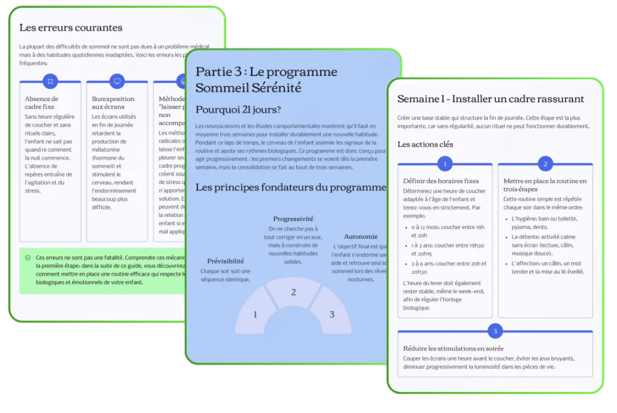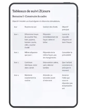 Programme 21 jours structuré : Semaine 1 on installe un cadre rassurant, semaine 2 on introduit des rituels apaisants, semaine 3 on consolide l’autonomie de votre enfant.