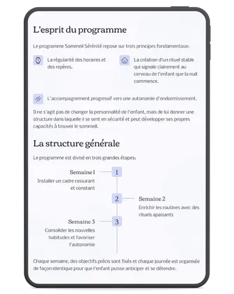 Le Programme pas-à-pas sur 3 semaines : Semaine 1 on installe un cadre rassurant, semaine 2 on introduit des rituels apaisants, semaine 3 on consolide l’autonomie de votre enfant.